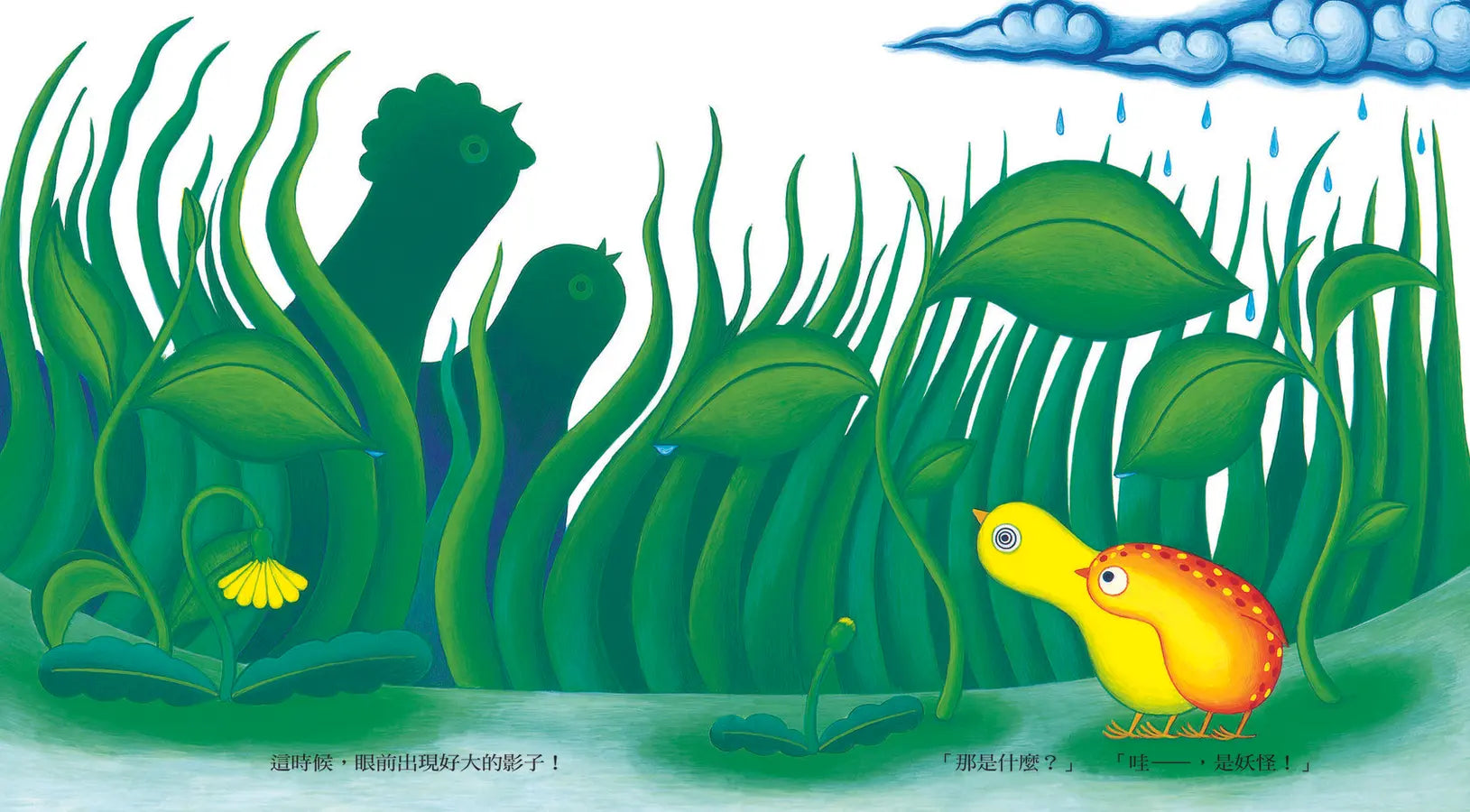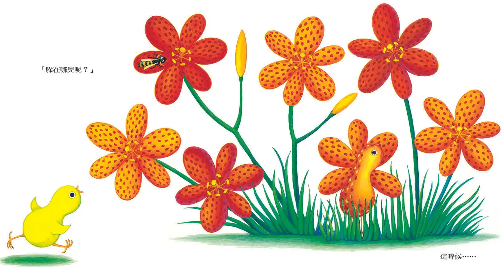 小鵪鶉和小雞在玩捉迷藏,「好了嗎?」「還沒!」「好了嗎?」「好了!」小鵪鶉先躲在花叢中,假裝是花瓣;小雞躲在大樹上,假裝是果實……牠們玩得不亦樂乎,天空卻突然下起了大雨,雨越下越大,前方還出現兩個好大的影子,小鵪鶉和小雞覺得好害怕,該怎麼辦呢?