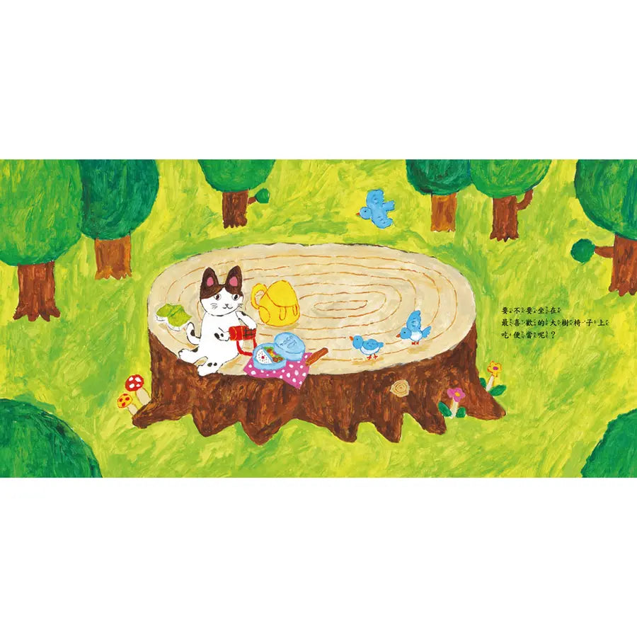 小貓咪喜歡帶著親手做的便當到各地野餐,無論是視野遼闊的山上,或是與朋友相約到河邊。「今天要去哪裡野餐呢?」他一邊準備飯菜,一邊想著……。