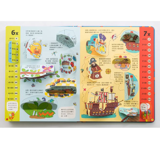 你可以坐上海盜船,跟著海盜前往七海尋寶,海盜鸚鵡還會跟你說個小祕密:「7×8=56其實很好記!」