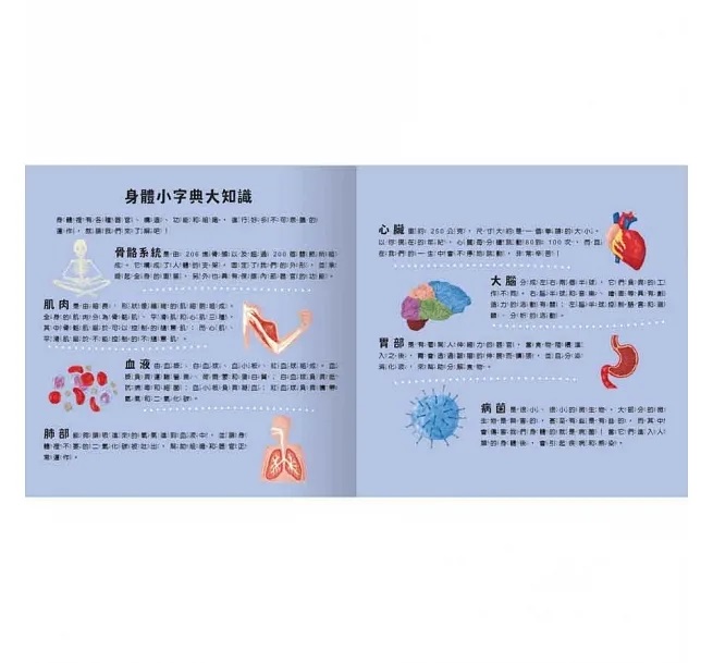 本 書介紹身體裡的各種構造、器官和功能,探索身體的奧祕,文字簡淺易懂又有趣,並有注音的標示,方便孩子閱讀。書末還附有延伸閱讀,為艱深的名詞做解釋,以增添知識含量喔!