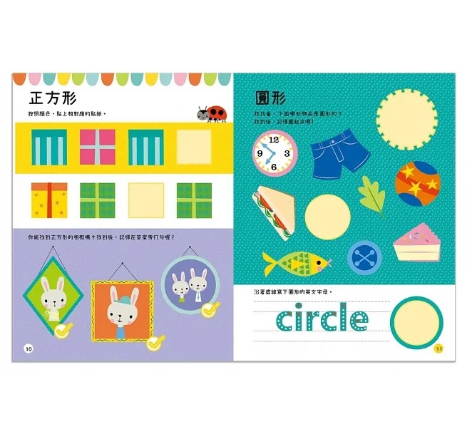 全書有13個趣味練習題、超過20張的互動貼紙,小朋友可以按照形狀,找到相對應的貼紙。從趣味中學習,並且培養基礎認知能力。